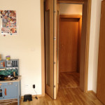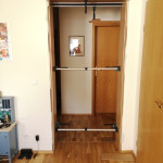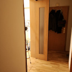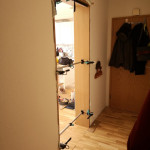 Unserer Kundschaft hatte ursprünglich den Wunsch, zum temporären Verschluss der geräumigen Wohnküche eine Schiebetür zum Flurbereich hin montieren zu lassen. Aber wegen der im Sturz geführten Stromkabel war die Montage einer klassischen Schiebetür nicht möglich. Eine Sonderlösung musste her denn eine normale Drehtür war wegen der räumlichen Gegebenheiten ebenso nicht möglich.